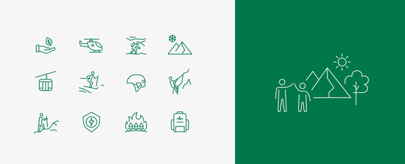 Im Folgenden steht Ihnen eine Auswahl an unterschiedlichen Piktogramm-Sets zum Download zur Verfügung. Aufgeteilt in zwei Kategorien finden Sie hier die Vielfalt der Bergwachtwelt. Es handelt sich dabei um fest definierte Symbole, die einheitlich in der Bergwacht zur Anwendung kommen sollten. In jedem Set befinden sich Daten für die Verwendung am Bildschirm (png und svg) und für den Druck (eps, jpg und tiff). Die Piktogramme werden jeweils in den Farben Grün und Weiß zur Verfügung gestellt.