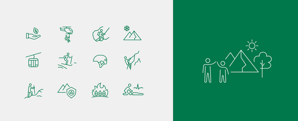 Im Folgenden steht Ihnen eine Auswahl an unterschiedlichen Piktogramm-Sets zum Download zur Verfügung. Aufgeteilt in zwei Kategorien finden Sie hier die Vielfalt der Bergwachtwelt. Es handelt sich dabei um fest definierte Symbole, die einheitlich in der Bergwacht zur Anwendung kommen sollten. In jedem Set befinden sich Daten für die Verwendung am Bildschirm (png und svg) und für den Druck (eps, jpg und tiff). Die Piktogramme werden jeweils in den Farben Grün und Weiß zur Verfügung gestellt.