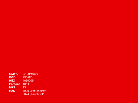 | DRK-Rot | 0/100/100/0 | 230/0/5 | #e60005 | 2347 U, 485 C / 13 | 3020 / 032 |